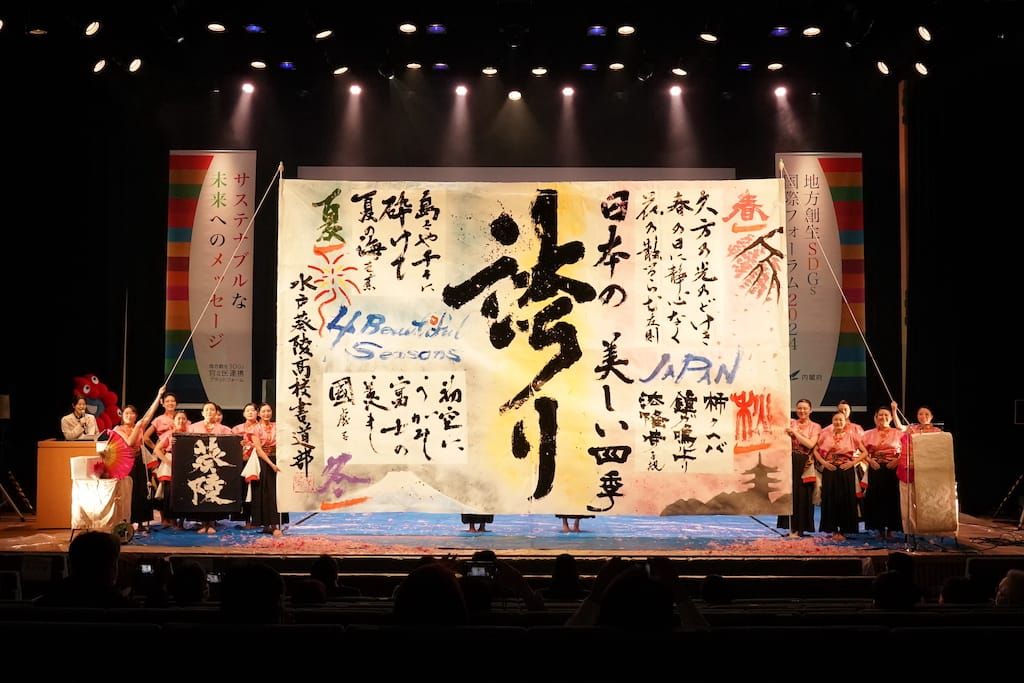 本フォーラムの締めくくりには、第16回書道パフォーマンス甲子園に本戦出場した茨城県水戸葵陵高等学校書道部により、「四季を大切にする気持ちが国を豊かに平和にする」として、美しい日本の四季をモチーフに、今回の万博のテーマでもある「いのち輝く未来社会」をイメージしたパフォーマンスが披露された。