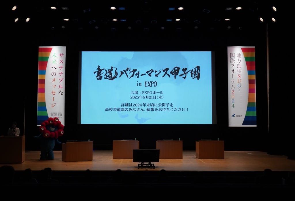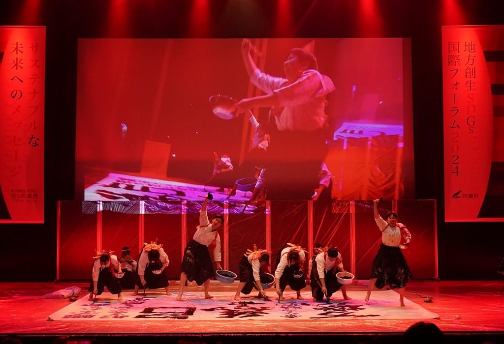 本フォーラムの締めくくりには、第16回書道パフォーマンス甲子園に本戦出場した茨城県水戸葵陵高等学校書道部により、「四季を大切にする気持ちが国を豊かに平和にする」として、美しい日本の四季をモチーフに、今回の万博のテーマでもある「いのち輝く未来社会」をイメージしたパフォーマンスが披露された。