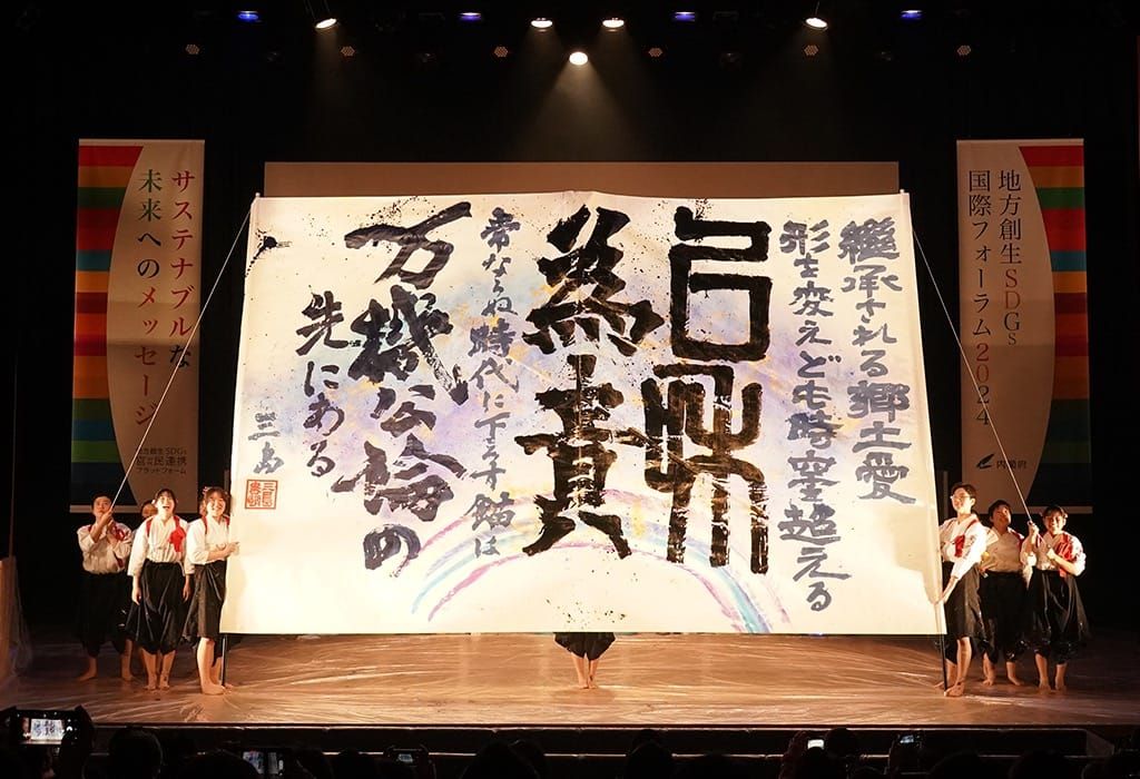書道パフォーマンス発祥の高校として知られる、全国的な書道の強豪校・愛媛県立三島高等学校書道部の息の合った力強いパフォーマンスが、本フォーラムの幕開けを華々しく飾った。テーマは「地域の未来」。